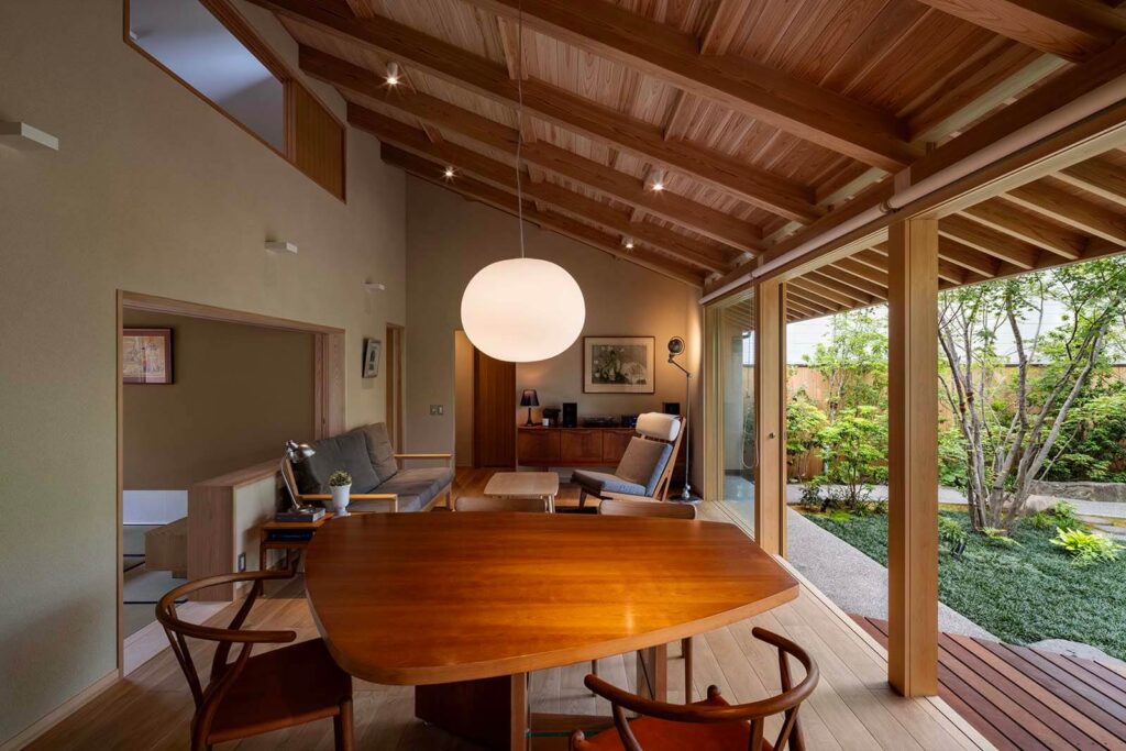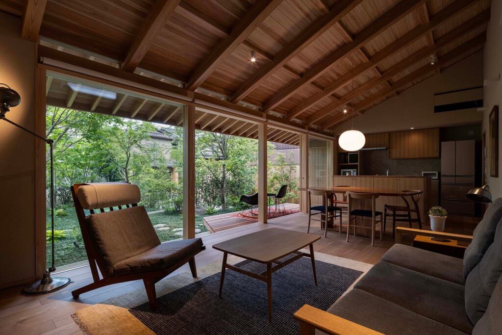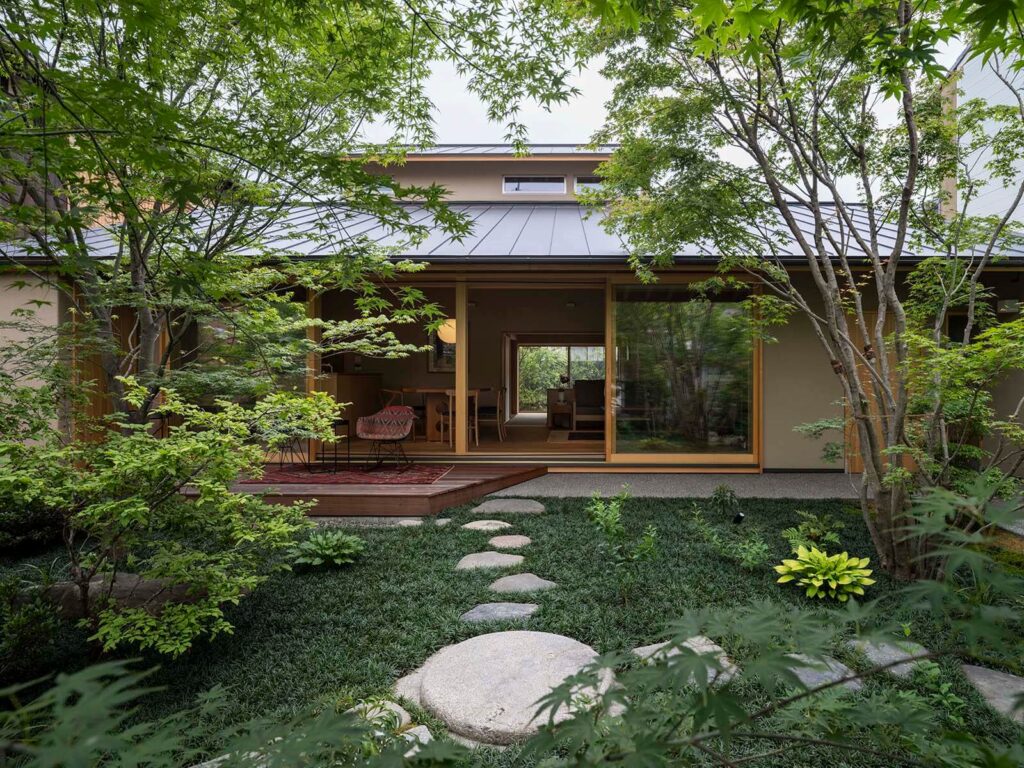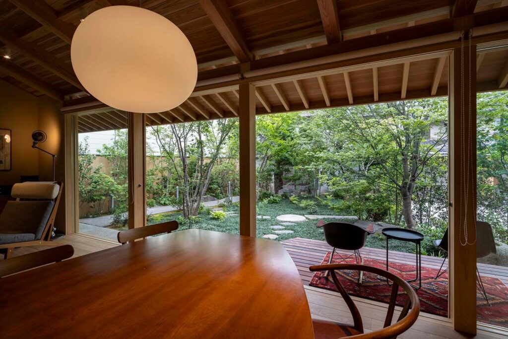 建物南側は庭に向かって大きく開けており、四季の移ろいを感じることのできる住まいです。 庭石は既存のものを再利用して、自然を感じられる趣のある庭に仕上がりました。