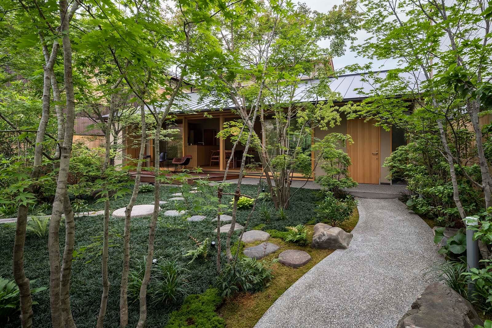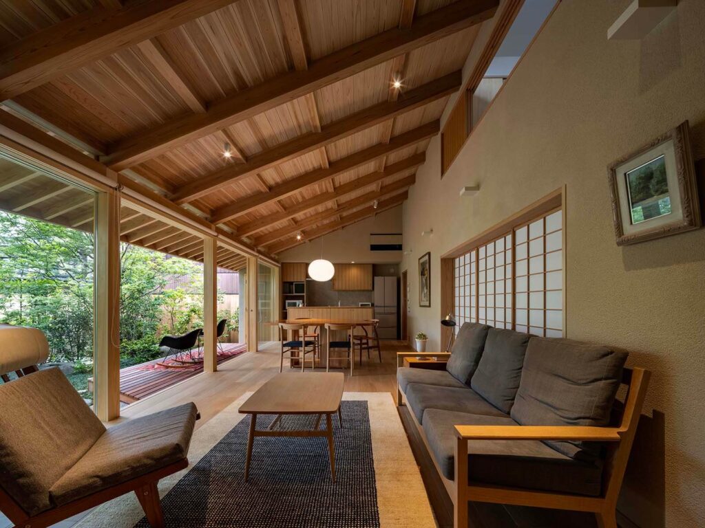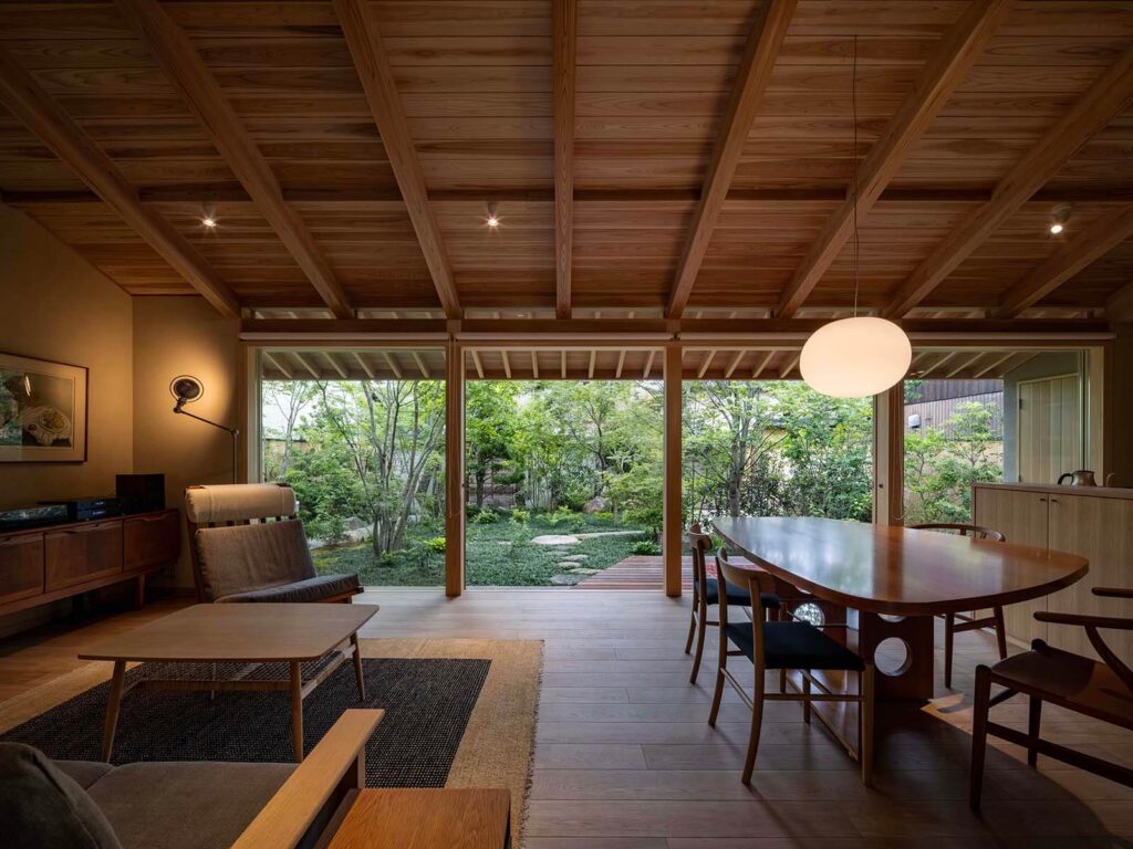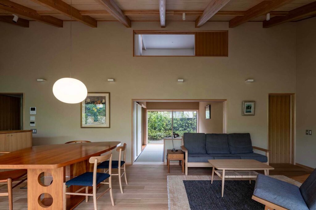 建物南側は庭に向かって大きく開けており、四季の移ろいを感じることのできる住まいです。 庭石は既存のものを再利用して、自然を感じられる趣のある庭に仕上がりました。